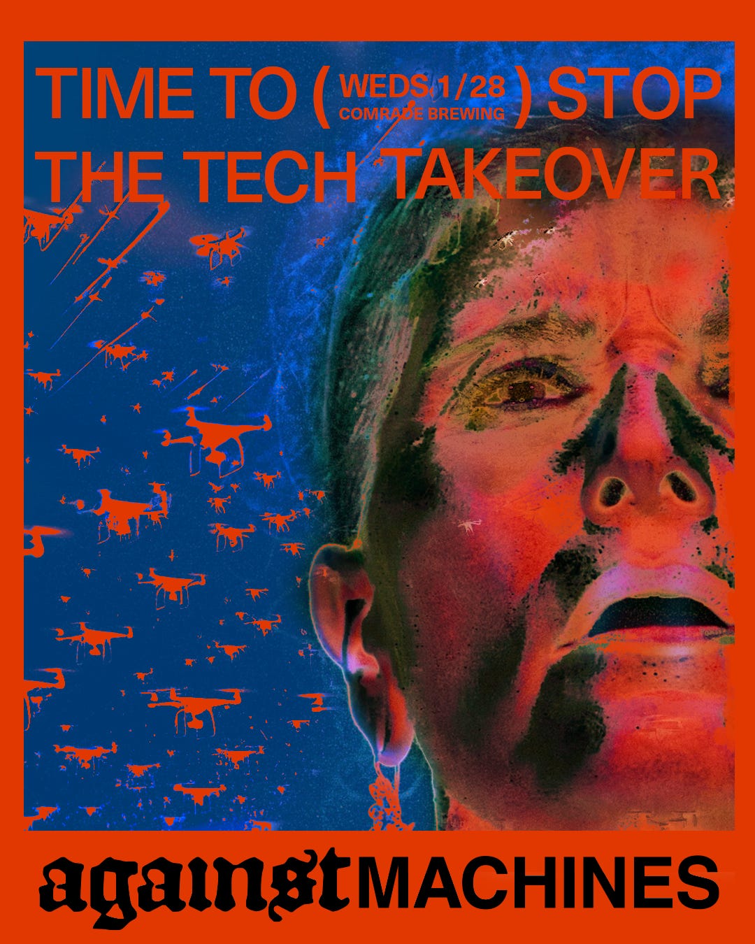 Against Machines is our movement to challenge tech-fascism and the exploitation of people by big tech and AI. We are hosting creative showcases, zine exchanges, and town halls with local politicians — building offline community and literacy around the tech issues that affect us all. Ultimately, we aim people away from screens towards civic involvement and advocacy for tech regulation. You can follow us on Instagram now, but we are exploring migrations to Upscrolled and Mastodon, and ultimately to de-platform from social media.