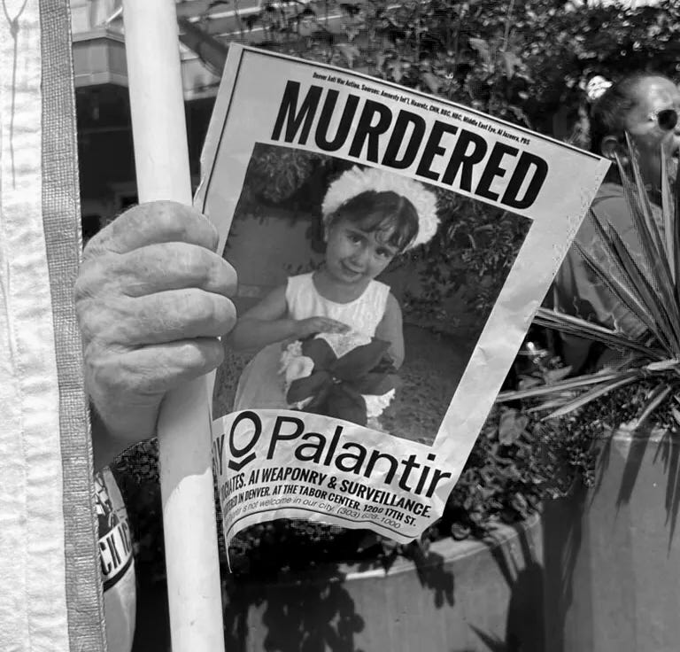 Since I couldn’t work with the New York Times on a retort, I worked with The Guardian to release an op-ed explaining ISTAR technology and condemning ICE for their unconstitutional surveillance. This threat, however, demanded much more than words. I soon stopped focusing on media and writing, and worked to build deeper roots with organizing networks in Denver and New York that had long been challenging Palantir, Silicon Valley, and our corrupted defense-industrial complex. In Denver, I helped lead a small and peaceful march towards Palantir’s HQ in support of Palestine and in opposition to ICE surveillance. There, we were followed by drones and dozens of police (at least one per protester) to find a wall of tactical units in full militarized gear and equipment protecting the surveillance giant — an incredible show of force and expense of city funds. In contrast, a similar protest in Seattle with around a thousand people would draw no police response.